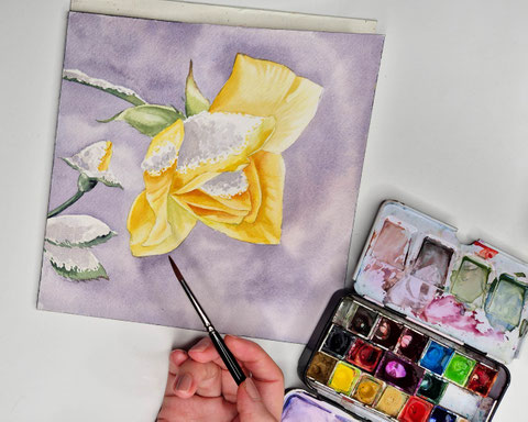 In diesem Online Livekurs malen wir eine schneebedeckte Rose mit Aquarellfarben. Der Kurs ist für alle geeignet, die schon einmal mit Aquarellfarben gemalt haben und Freude an dem Motiv haben.