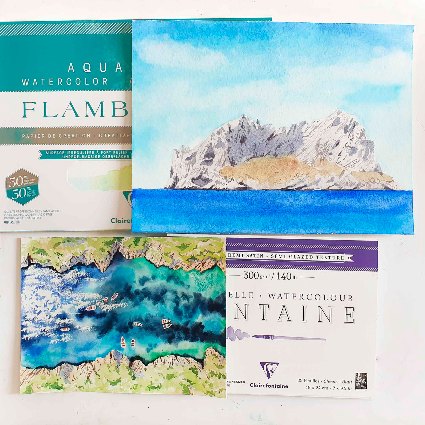 Auf dem Foto hier siehst du fünf Versionen einer Landschaft – die habe ich übrigens von einer kleinen Paddeltour mitgebracht. Die Szene am Wasser hat mich so inspiriert, dass ich sie gleich mehrmals in Aquarell umgesetzt habe. An diesem Beispiel möchte ich dir zeigen, wie spannend es sein kann, ein Motiv auf unterschiedliche Weise darzustellen. Mal liegt der Fokus mehr auf den Bäumen, mal auf dem Wasser, mal auf den Kontrasten. Lass dich von den Variationen inspirieren und probiere selbst aus, welche Möglichkeiten in deinem Motiv stecken.